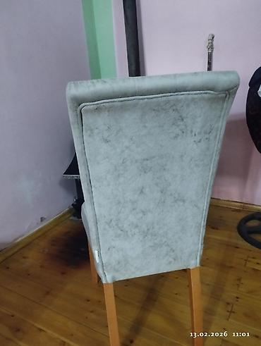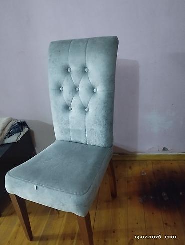 - Stullar: Yumşaq oturacaq və yüksək bel. Bel hissəsində düyməli kapitone tikişli dizayn komfort və estetika verir. Parça örtük pastel-boz rəngdədir, toxunuşda zərif, vizual olaraq mat-səmərəli görünüş yaradır. Ayaqlar taxtadandır və masanın tonlarına yaxındır.