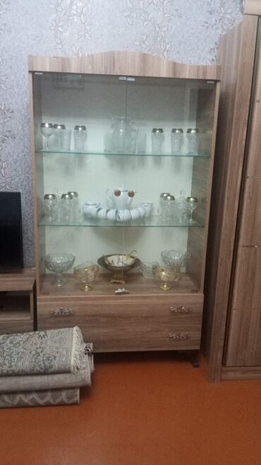 - Vitrin şkafı: şüşə qapılı, iki şüşə rəf, aşağı hissədə iki geniş çəkməcə; qab-qacaq və aksesuarlar üçün nümayiş imkanı.