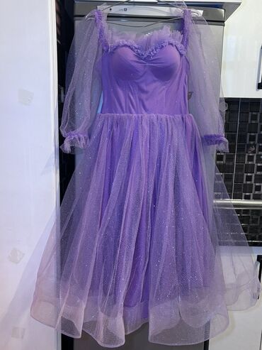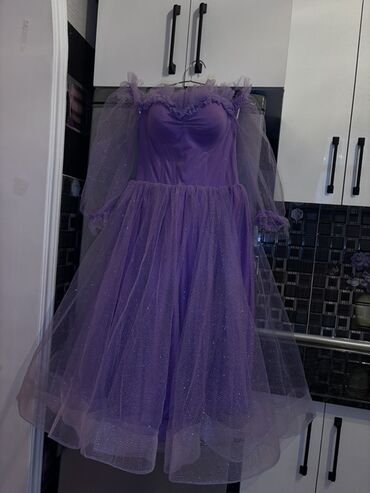 Bənövşəyi rəngdə, zərli tüllə işlənmiş zərif ziyafət/keçid donu/korsetli/arxası iplə yığıln.