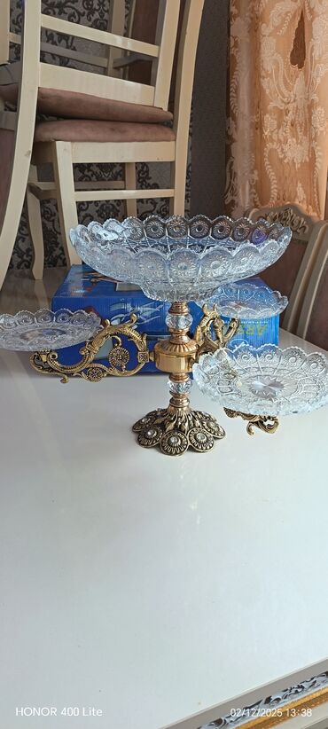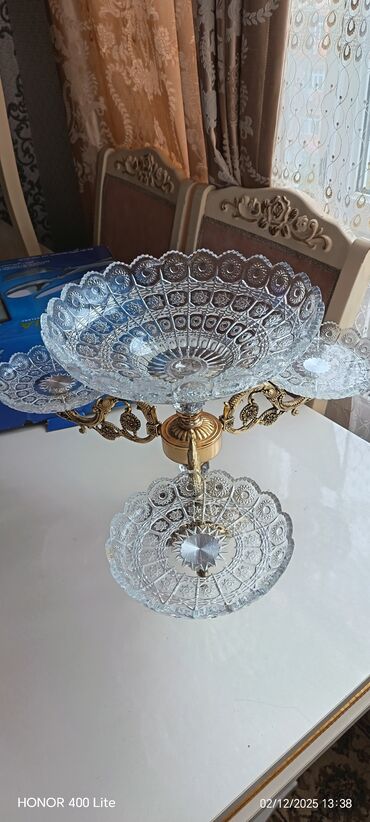Altiqabli şüşə-meyvə ve lepe qabi(klassik dizayn) - Material: kəsimli kristal üslublu şəffaf şüşə kasalar, metal (qızılı tonlarda) dekorativ gövdə və dayaq - Quruluş: 1 böyük mərkəzi kasa + 5 yan ...