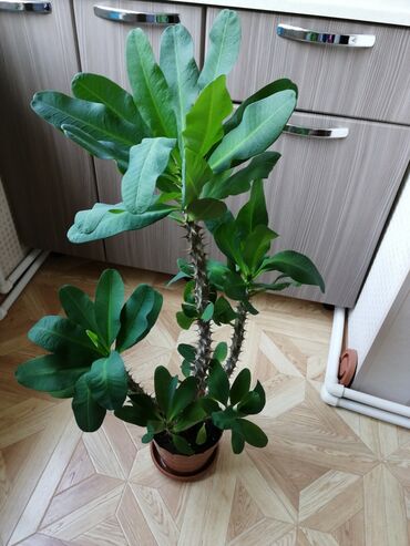 - Euphorbia milii (Tikanlı tac): Şaxəli gövdəli, iri parlaq yarpaqlı dekorativ kaktusvari sukulent. İşıqlı yer sevir, az suvarma ilə kifayətlənir. Çiçəklənən zoğları var. Plastik dibçək və altlıqla birlikdə.