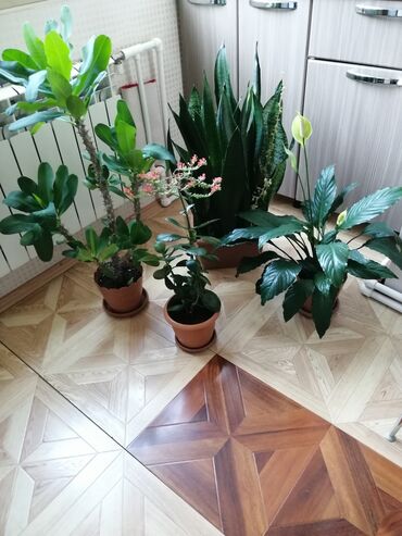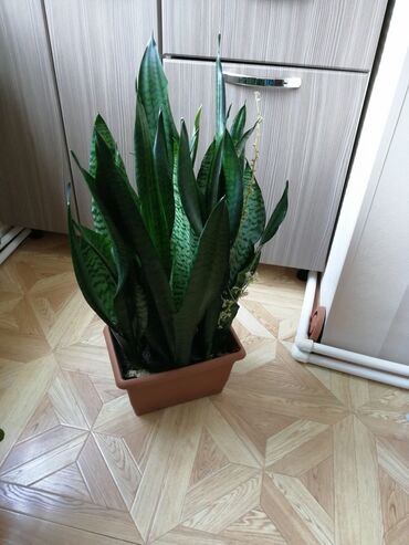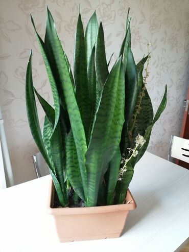 - Sansevieria (Qaynanadili): Uzun, dik, naxışlı yarpaqlar. Havanı təmizləyən, çox dözümlü bitkidir; az su və diffuz işıqda yaxşı inkişaf edir. Düzbucaqlı plastik qabda, drenajlı.