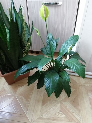 - Spathiphyllum (Sülh çiçəyi): Tünd yaşıl iri yarpaqlar və açıq-yaşıl ağ çiçək süpürgələri ilə. Kölgəyə dözümlüdür, torpaq daim azacıq nəm saxlanılmalıdır. Plastik dibçək və altlıq daxildir.