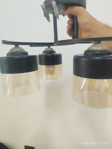 - Dizayn: Mat qara metal gövdə, qızılı detal vurğuları və dumanlı (ambre) rəngli silindrik şüşə plafonlar
