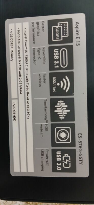 - Model: Acer Aspire E 15 (etiketdə: ES‑?15, Series E 15)