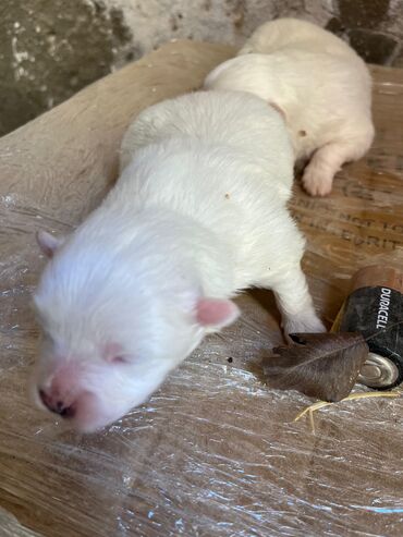 Şirin, ağ rəngli Spitz (Pomeranian tipli) balası. Xüsusiyyətlər: - Cins: Kiçik ölçülü Spitz/Pomeranian tipli dekorativ it - Rəng: Tam ağ, tüklü “puff” kürk örtüyü - Cinsiyyət: Erkək - Yaş qrupu: Y...