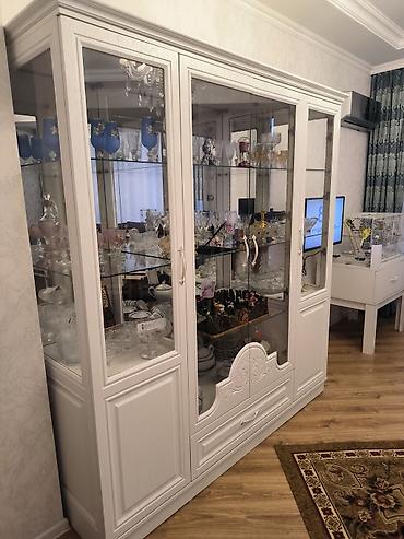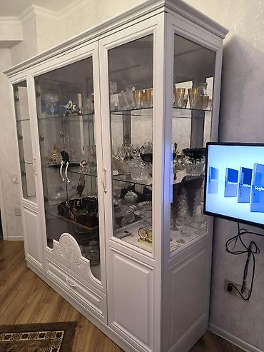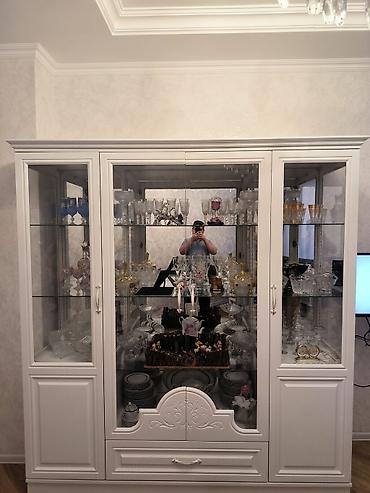 - Material: laminat/MDFlam görünüşlü korpus, ön və yan panellərdə şüşə vitrin qapıları