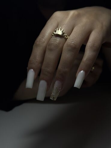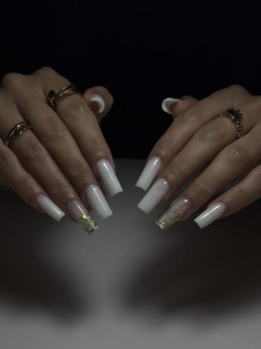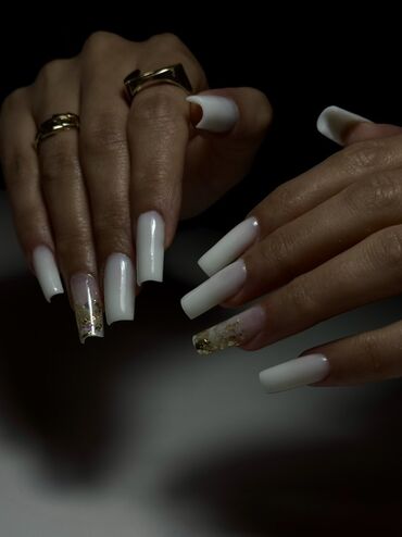 Akril/Gel manikür xidməti – uzun “coffin” forma, süd-ağ ombre effektli dırnaqlar. Dizayn seti: