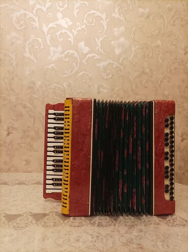 Akkordeon – klavişli və bas düyməli - Tip: Klavişli akkordeon (piano klaviaturası) və sağ tərəfdə bas/akord düymələri - Korpus: Qəhvəyi-mərmər fakturalı örtük, metal yan qapaqlar, klassik keçə kör...