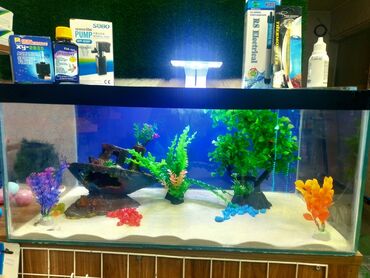 Akvaryum ve 4 eded balığ 2 si qızıl balığdır İstifadə üçün qeyd: - Filtr və havalandırmanı qoşaraq suyun təmizliyini təmin etmək - Çınqılın yuyulması və suyun dövri yenilənməsi - Kiçik və orta ölç...