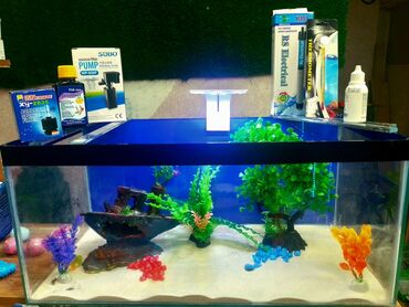 Akvaryum dəsti – tam işlək dekorativ balıqlar və avadanlıqla - Şüşə akvaryum, təqribən orta ölçü; üst qapaqlı. - Daxili filtr və hava verən sistem görünür; suyun təmizliyi və oksigenlə təminatı üç...