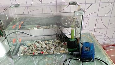 - Şüşə akvarium: düzbucaqlı, yanlarında möhkəmləndirici künc tutacaqları. İçində dekorativ çay daşları ilə döşəmə.