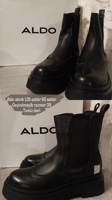 Şəkildəki mətndə: “Aldo alınıb 135 satılır 80 satılır, Geyinilməyib razmer 39, Təmiz dəri”.