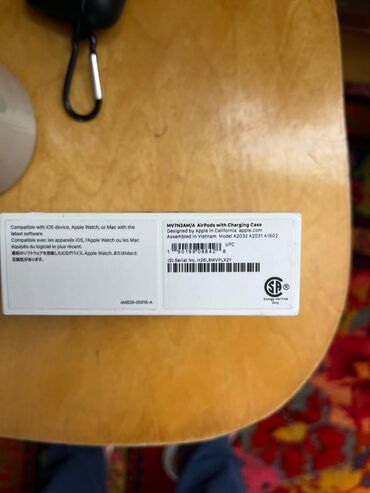 - Qutunun altında model və uyğunluq məlumatları aydın görünür: “AirPods with Charging Case”, “Designed by Apple in California”, “Assembled in Vietnam”, model nömrələri A2032/A2031/A1602.