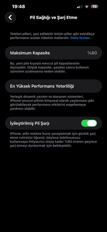 - Batareya: Pil Sağlığı və Şarj ekranına görə maksimum kapasite 80%; “İyileştirilmiş Pil Şarjı” aktiv