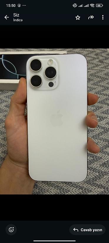 Apple iPhone 16 Pro Max – Titan gövdə, ağ rəng Xüsusiyyətlər: - Model: iPhone 15 Pro Max - Rəng: Ağ (White/Titan) - Ekran: 6.7" Super Retina XDR, Dynamic Island - Arxa kamera sistemi: 48 MP əsas, ...