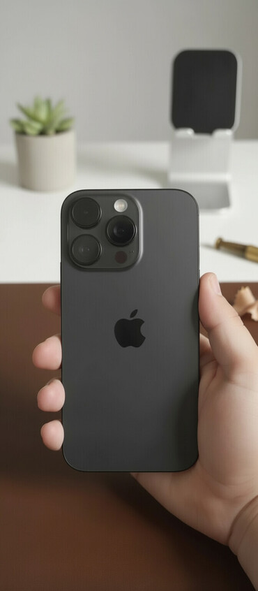 Apple iPhone (qara rəng, Dynamic Island ön paneli və üçlü arxa kamera modulu)