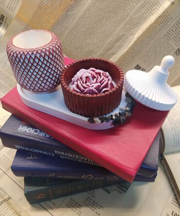 Məhsul: Gül formalı dekorativ şam (qablı) Təsvir: - Dərin bordo rəngli, dişli kənarlı dekorativ qabın içində gül ləçəklərini xatırladan fiqurlu şam. - Şamın rəngi bordo-bənövşəyi və ağ çalarların ...