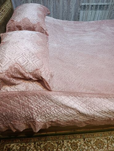 Yataq örtüyü dəsti - Rəng: açıq çəhrayı, parıltılı atlas tipli toxuma - Naqış: güllü işləmələr və dekorativ haşiyə - Pakrival ölçüsü: uzunluq 2 m 15 sm, en 2 m 40 sm - Yastıq üzləri: 2 ədəd, ölçü ...