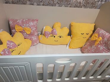 - Komplektdə yumşaq qoruyucu yastıq dəsti görünür (sarı və çəhrayı dizayn), döşək də var