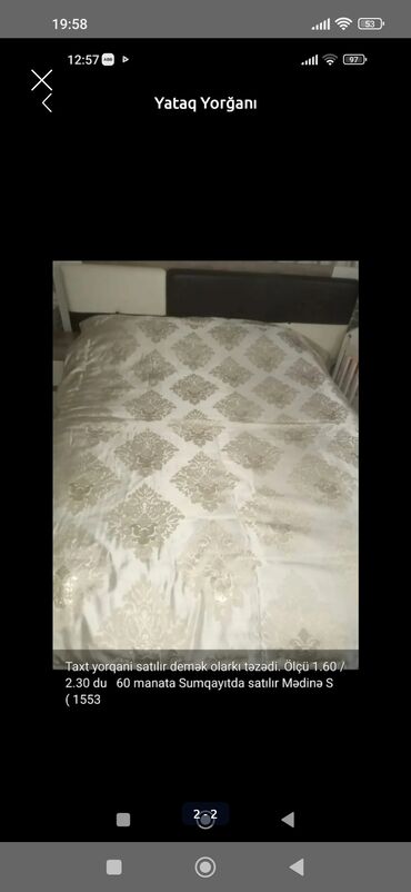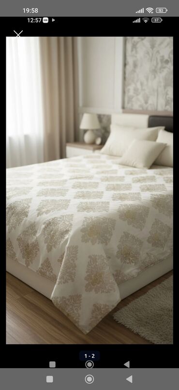 Məhsul: Yataq yorğanı (taxt üçün) - Rəng: Açıq krem/ağ fon üzərində zərif damask naxışları - Material görünüşü: İpək kimi parıltılı, naxışlı üst qat - Ölçü: 1.60 x 2.30 m - İstifadə sahəsi: İki nə...