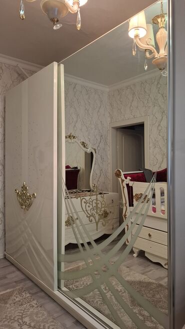 - Paltar şkafı: Sürgülü qapılar, tam boy güzgü. Güzgüdə qum-oyma naxışlar, fasadda qızılı ornamentlər.