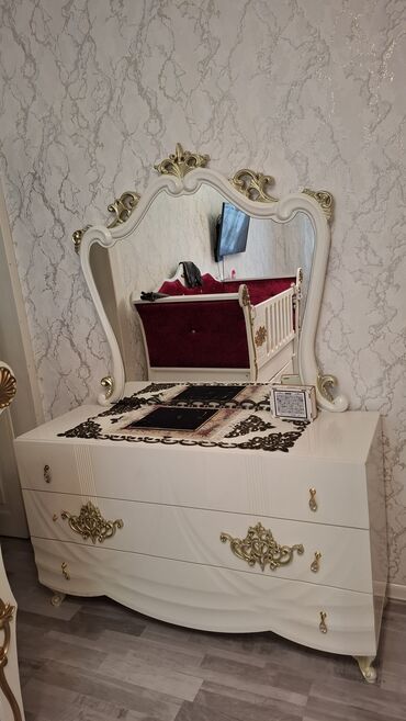 - Komod-güzgü: Üç iri çekmeceli komod, yuxarıda böyük dekorativ güzgü. Qızılı fitinqlər və kristal tipli tutacaqlar.