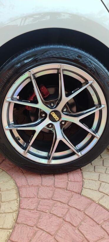 19 düym yüngül lehimli disk və təkər komplekti - Disk: çoxşüalı, gümüş rəng, mərkəz qapaqlı, 5 boltlu (5x? – bolt oturacaqları görünür), böyük əyləc sistemlərinə uyğundur. - Təkər: 245/40 ZR19 ölç...