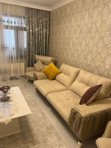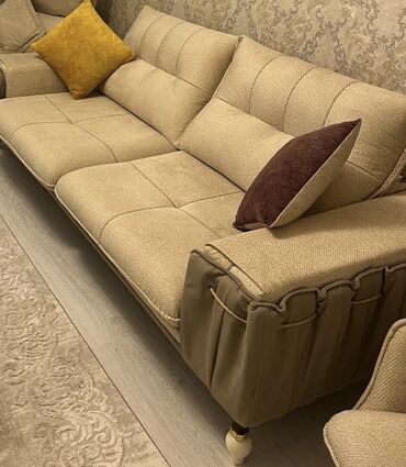 Mebel: Klassik üslubda 3 yerlik divan - Rəng: Qum-bej (kakao tonlarında dekor yastıqlar daxil) - Parça: Yumşaq, toxuması zərif məxmər effekti verən döşəmə - Dizayn: Tam kapitone (düyməli) arxa və ...