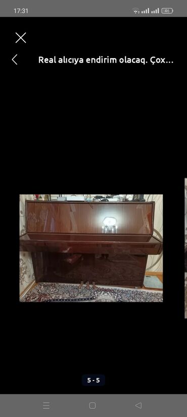 Məhsul: Belarus upright piano - Brend/model: “Беларусь” akustik piano (upright) - Korpus: yüksək parıltılı qəhvəyi/maun rəngli ağac örtük, klassik düz formalı. - Klaviatura: 88 klaviş, ağ/qaradəri...