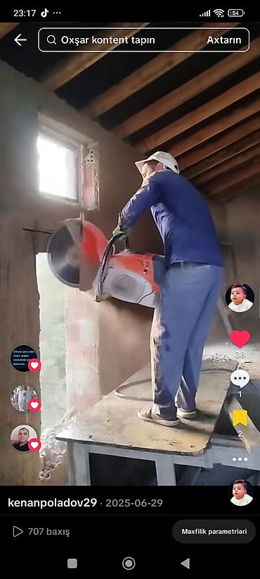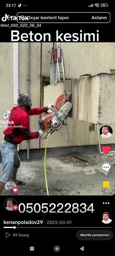Beton kəsmə–deşmə xidməti - Dəmirsiz və armaturlu betonun kəsilməsi, deşilməsi və sökülməsi - Divar, döşəmə, tavan, bordür və bünövrə hissələrinin kəsilməsi - Qapı-pəncərə açılışlarının alınması, ...