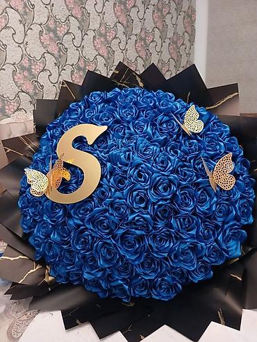 Müştərinin istəyi ilə hərf/əlamət əlavə edilib fərdiləşdirilə bilən mavi mono-gül buketi.