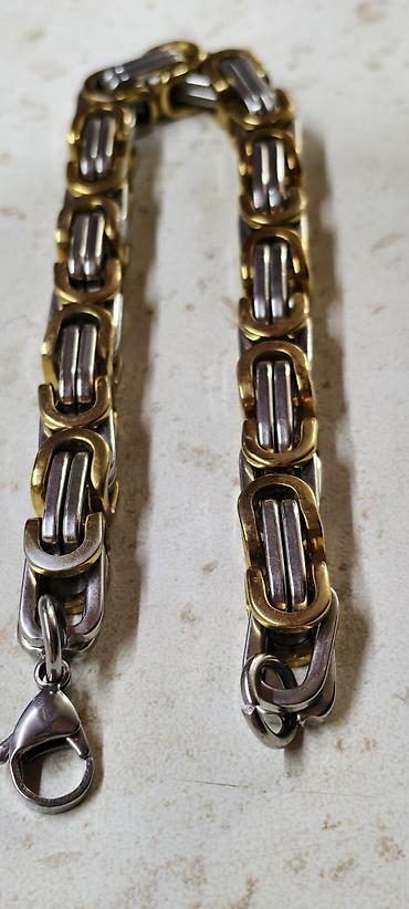 - Dizayn: iri halqalı, modul bəndli zəncir; hər bənddə gümüşü mərkəz hissə və qızılı kontur; hər iki ucda möhkəm karabin tipli qapanma