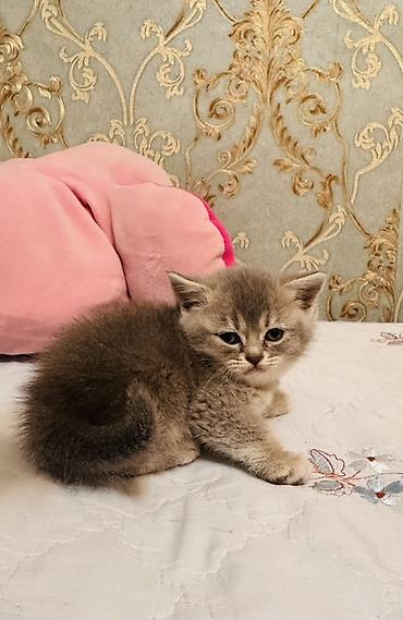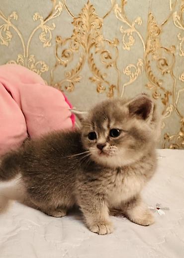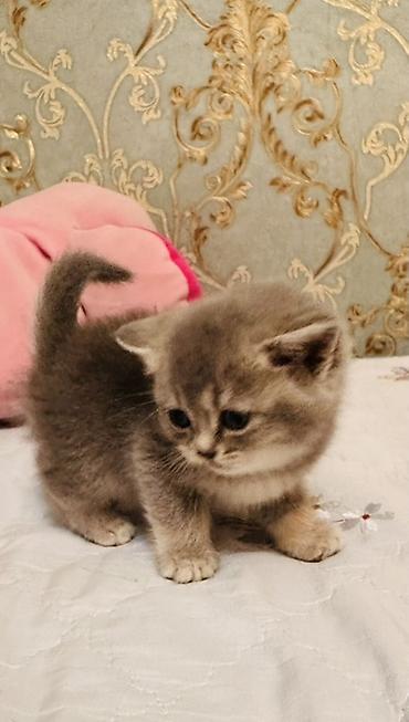 Britan tipli (Scottish Fold görünüşlü) boz-gümüş rəngli balaca pişik balaları. Xüsusiyyətlər: - Yumşaq, sıx və parlaq boz/gümüş qalın yun, sinədə ağ ləkə - Qısa, kompakt bədən quruluşu, güclü pənc...