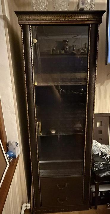 - Dar şüşə vitrin: tək şüşə qapı, çoxsəviyyəli rəflər, aşağıda 2 siyirmə.