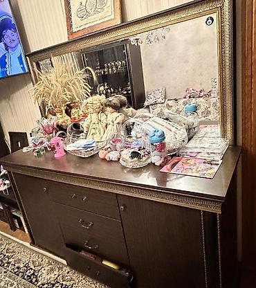 - Geniş kumod güzgü ilə: iri güzgü paneli, ortada siyirmələr, yanlarda dolab qapıları və əlavə aşağı siyirmə; üst paneli dekor və məişət ləvazimatları üçün rahatdır.