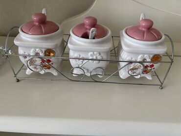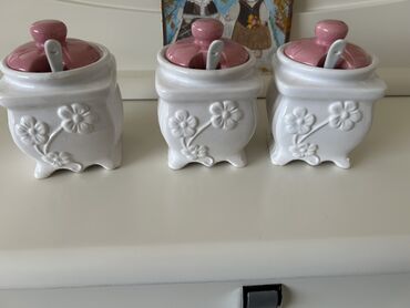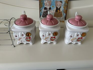 Mətbəx üçün keramika qab dəsti - 5 ədəd ağ rəngli, fakturalı keramika qab -İki ədəd qab qapaqlıdır (Tuz, Çay), digər üçü açıq ağızlıdır,ona göre ucuz verirem3 nün qapağı yoxdur - Yumru forma, dekor...