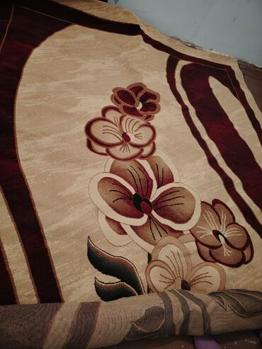 - Dizayn: krem fon üzərində qırmızı-bordo tonlarında böyük çiçək naxışları və zolaqlı bordür.
