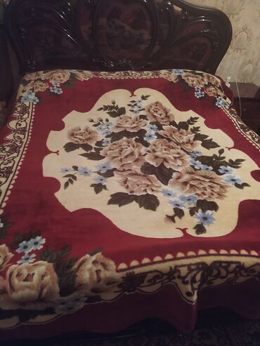Yataq Satılır - Ölçü: təxminən tək nəfərlik yataq üçün (şəkildə tək çarpayı üzərində) - Material: yumşaq, qalın və isti flis/plyuş tipli toxuma - Rəng və naxış: kənarları tünd qırmızı, orta hissə...