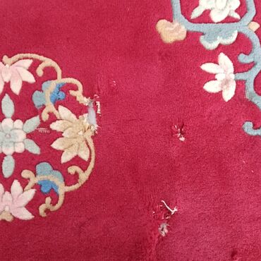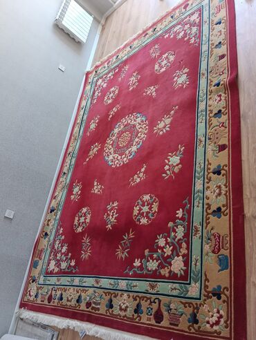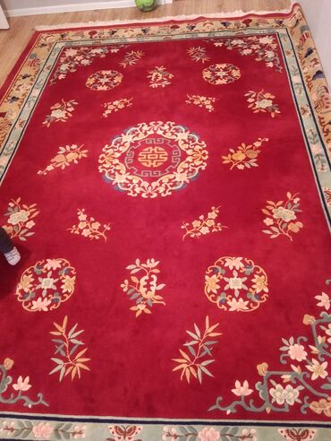 Xalça – klassik Çin üslubunda, dərin qırmızı fonlu, çiçək və medalyon ornamentləri ilə. Kənar haşiyəsində açıq mavi və bej tonlarında dekorativ motivlər, ucları saçaqlıdır. Yumşaq, sıx xovlu quruluş.