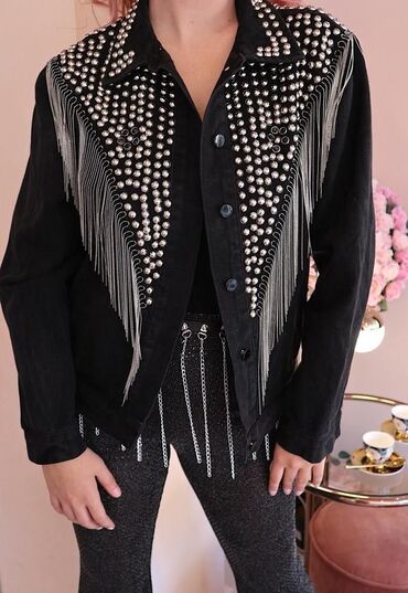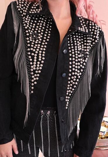 Geyimin əsas özəlliyi – parlaq metal detallarla tam örtülmüş ön panel və hərəkətdə sallanıb parıldayan zəncir-saçaqlar. Kombin üçün sadə köynək, cins və ya don üzərində vurğu parça kimi idealdır.