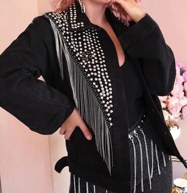Qadınlar üçün şık qara cins gödəkçə. - Material: sıx cins/parça, iç hissəsi yumşaq tüklü astarlı. - Yaxa: həcmli qara süni kürk yaxa, isti və dekorativ görünüş. - Bəzək: ön və arxa hissədə mirvari...