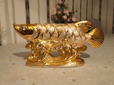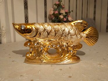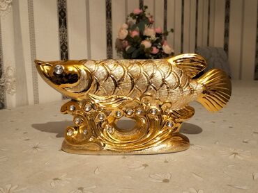 Qızılı Arowana balığı fiquru – dekorativ heykəl - Material: parıltılı qızılı rəngli kompozit/metal ərintisi (parlaq xrom detal və qırmızı göz aksentləri) - Dizayn: pulcuqlar sikkə motivləri ilə iş...Giriş•Qeydiyyat
