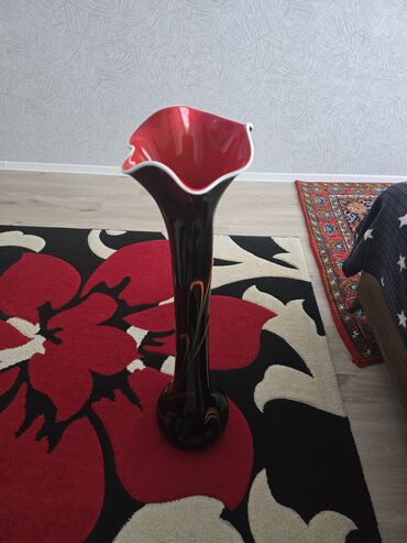 Dekorativ döşəmə vazası - MateriaI: Şüşə - Rəng: Qara üzərində ağ naxışlar, iç hissə açıq boz - Dizayn: Dalğalı, zərif formaya malik hündür siluet; aşağı hissədə geniş dayaq, gövdədə spiral/ağ xət...