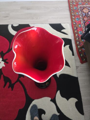 Bəzəkli şüşə vaza - Material: qalın rəngli şüşə, parlaq qızılı tonlarda metal və ya qızıl suyuna çəkilmiş haşiyələr - Rəng: tünd narıncı-bordo şüşə gövdə - Dekor: gövdənin ön hissəsində əl naxışlı...