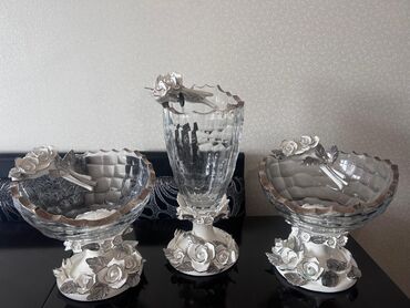 - Material: qalın kəsimli şüşə/kristal kasa və vazalar, metal rəngli kənar haşiyə