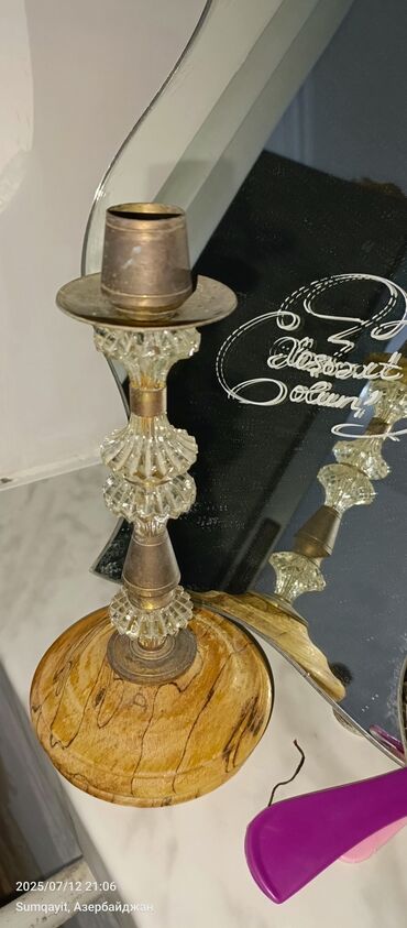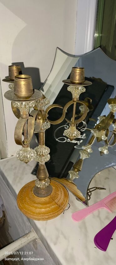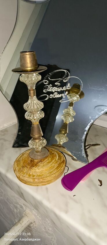 - Materiallar: metal gövdə, kəsimli şüşə bəzəklər, taxta əsaslı podstavkalar