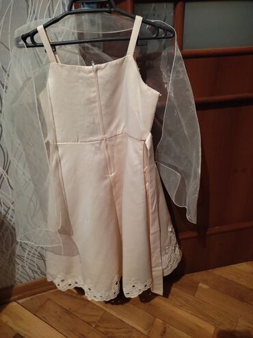 Məhsul: Qız uşağı üçün zərif ziyafət/libas - Rəng: Şaftalı tonlarında üst hissə, açıq krem tull ətək - Ölçü: Uşaq ölçüsü (kəmərli dizayn), arxadan gizli fermuar. 1defe geyinilib 1yasinda ad gününd...
