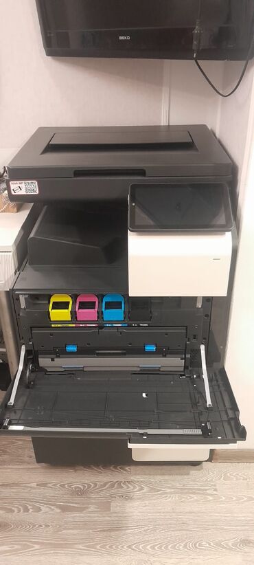 Komplekt: korpus, sensor idarəetmə paneli, CMYK toner yuvaları, çoxlu kağız çekmecələri. A3/A4 rəngli sənəd axınları üçün peşəkar həll.