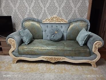 - Material: Yumşaq məxməri/parça üzlük + qızılı ornamentli dekorativ kumaş; kəsimli massiv taxta karkas və oyma ayaqlar
